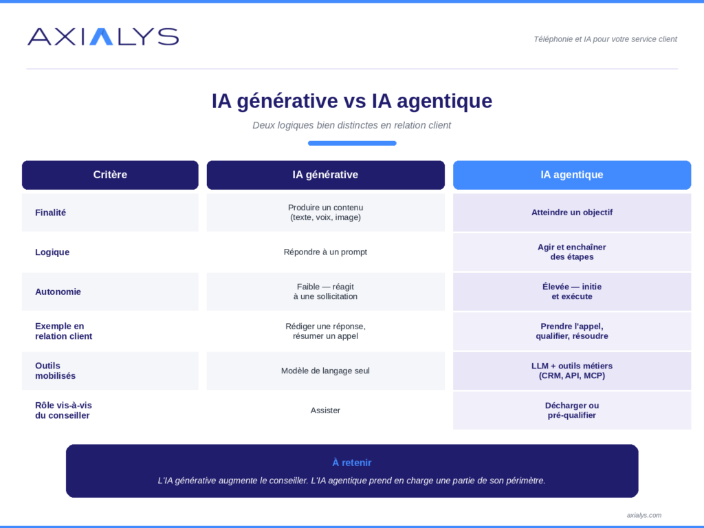 En clair : l’IA générative augmente le conseiller, l’IA agentique prend en charge une partie de son périmètre.